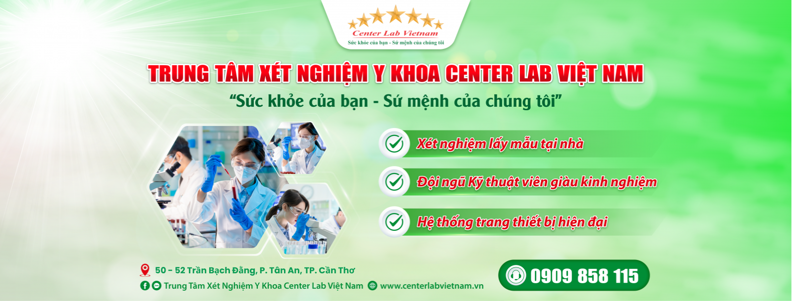 Mang trong mình sứ mệnh cùng phương châm hoạt động “Chuyên nghiệp - Chính xác - Tận tâm", chúng tôi hi vọng sẽ tiếp cận nhiều hơn và được đóng góp nhiều hơn trong hành trình mang đến sức khoẻ toàn diện cho mỗi người. Hãy đến Center Lab để trải nghiệm sự khác biệt, hãy để chúng tôi được phục vụ bạn.